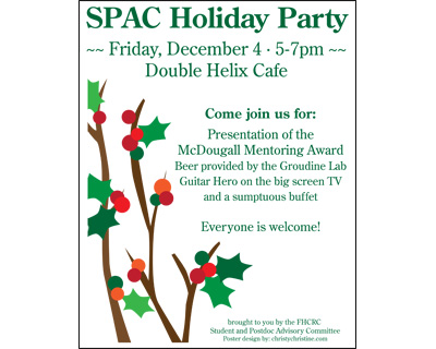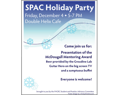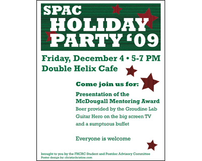 These posters were designed for the Fred Hutchinson SPAC Holiday Party. The posters were displayed in the building to generate interest in the party. All three designs were used.